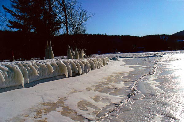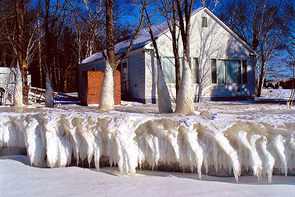 Layers Of Winter Ice Form On Aroostook County Lake Retainer Wall.Add Some Drews Lake Water, A Stiff Northern Maine Wind..And Natural Ice Sculptures.Enjoying The Tail End Of Another Incredible Day On A Maine Lake. The summer at the lake in Linneus Maine is warm and sunny. In the winter in Aroostook County the sky is sunny and crystal blue, but not so warm temperatures. No black flies. This is a summer place I am lucky enough to own for the four kids to enjoy. It always has a breeze off the Big Lake. That breeze creates something you can see. In the winter, water from Drews Lake splashes up against the concrete retainer wall and this can happen. Artwork, surreal ice layerings with the hands of the artist being a Northern Maine wind and lake water applied in waves, splashes.