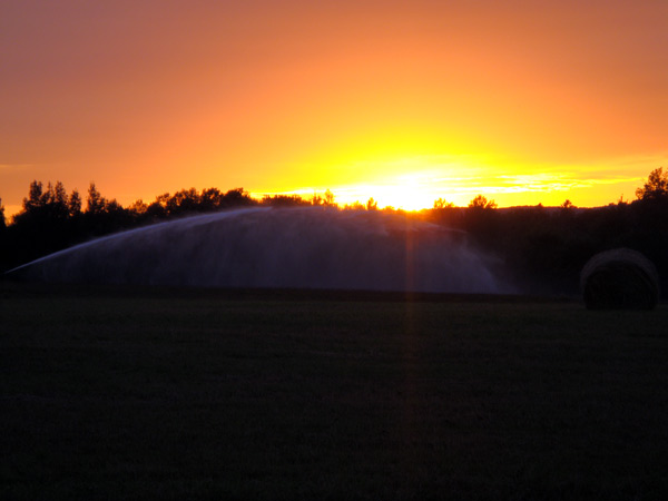 This is what the irrigation of the Maine potatoes, spud fields looks like at sunset on the farm.