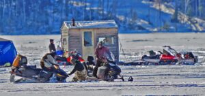 Lake Ice fishing in Maine. The warmer than usual temperatures earlier this winter made Maine lake ice fishing impossible. Open water kept ice fishing shacks from populating Maine lakes earlier